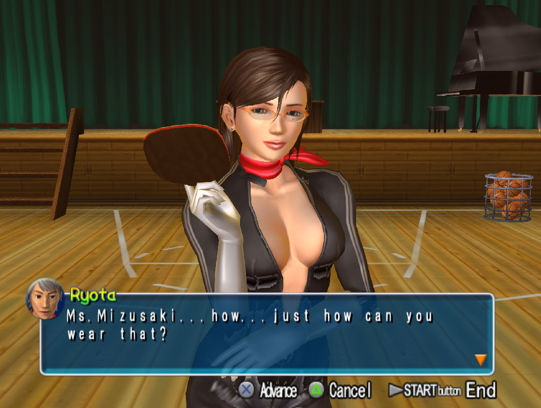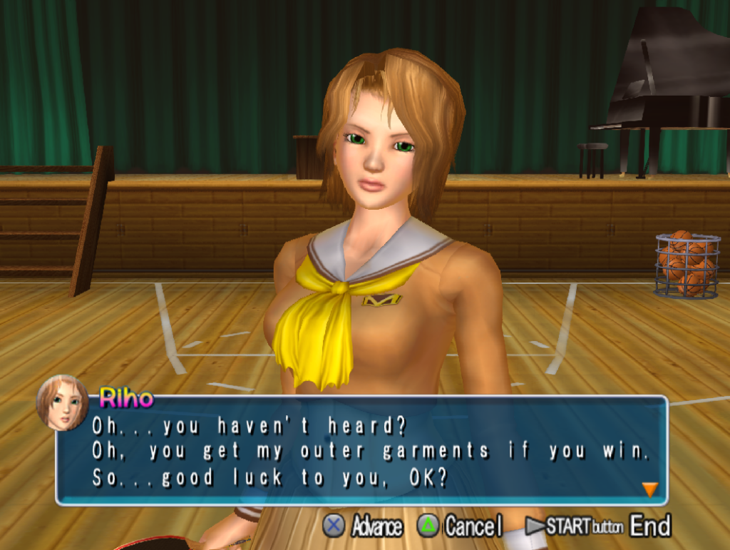 …that said, I’m kind of glad I at least decided to stick through with it for the story mode, because it gets fucking insane. Like Rumble Roses, the story mode has this vague, overarching conspiracy with evil scientists, experiments, and robots… except that this made sense for Rumble Roses, since that was a wresting game. Pink Pong is a game about playing strip ping-pong at a high school gym, it couldn’t possibly be lower-stakes than that. In this game’s narrative, you’ve got some evil organization creating robots to… copy your table tennis techniques? Except that your character is a complete novice, so how would they even have known that you’d be so good that you needed to be studied? And what are they even going to do with your ping-pong skills anyway…? It’s even more stupid than if they hadn’t bothered with a story mode… but I kind of have to appreciate the unhinged insanity of this plot. I was not expecting to get any sort of entertainment out of this game’s story mode, but it hooked me enough that I did four playthroughs just to get to the true ending (which wasn’t really worth the effort… but, hey, they got me curious enough to check it out).
