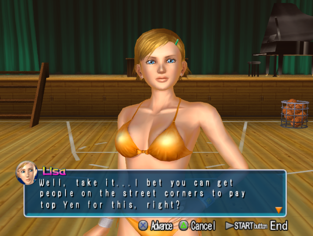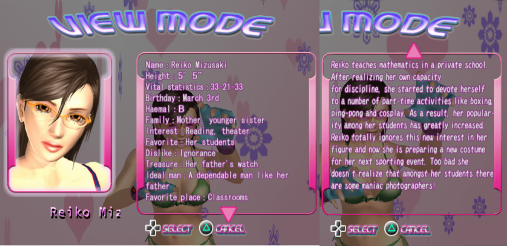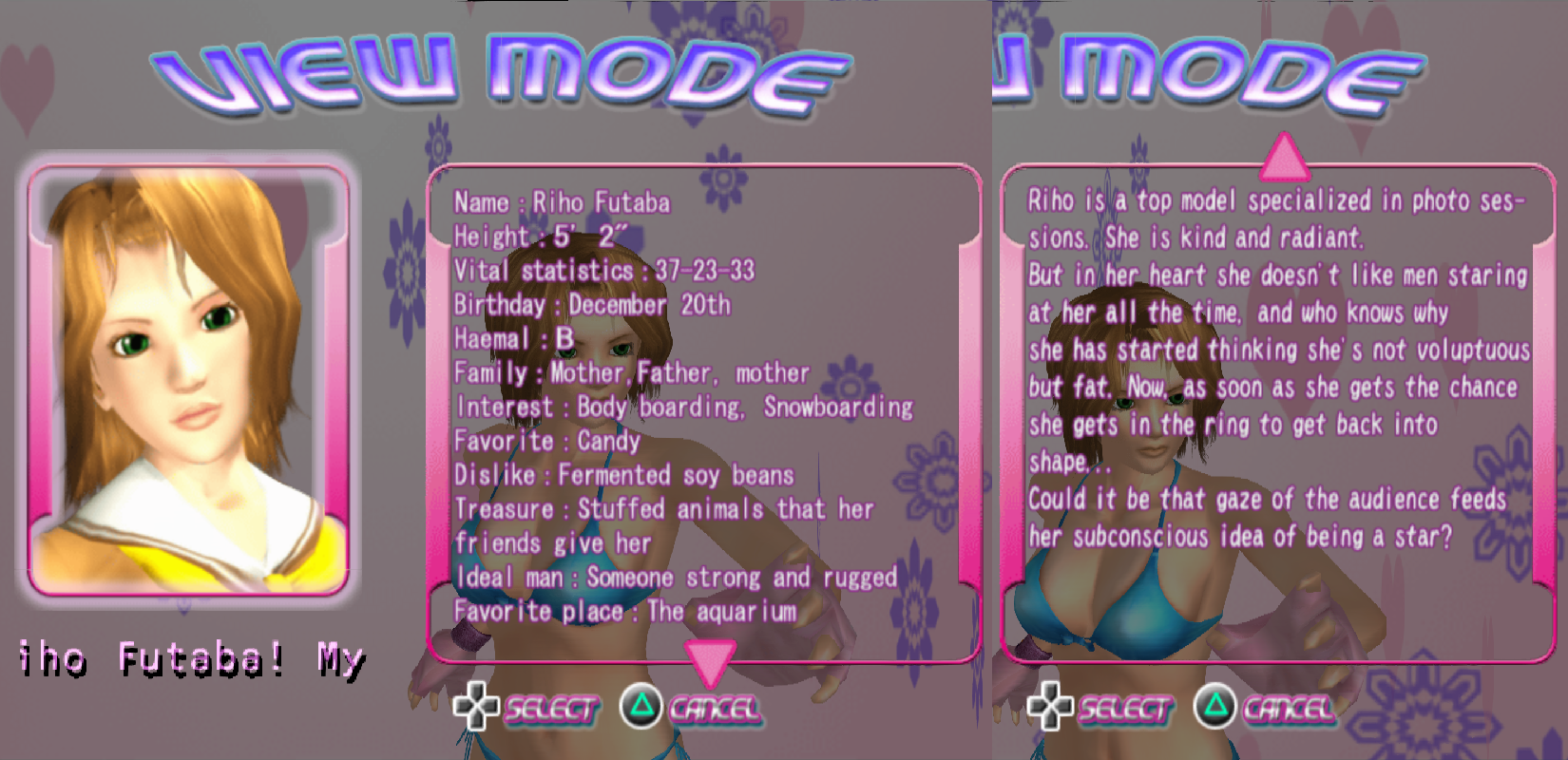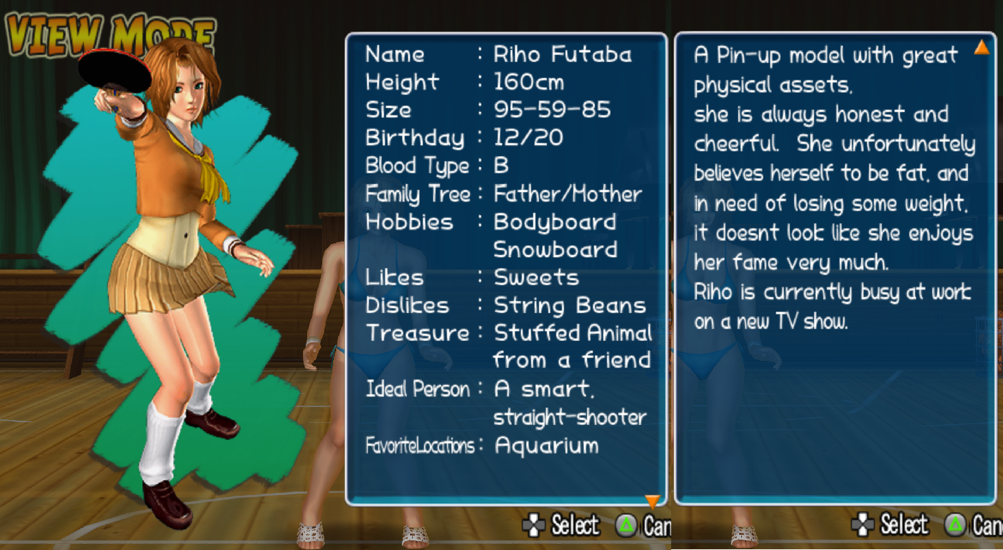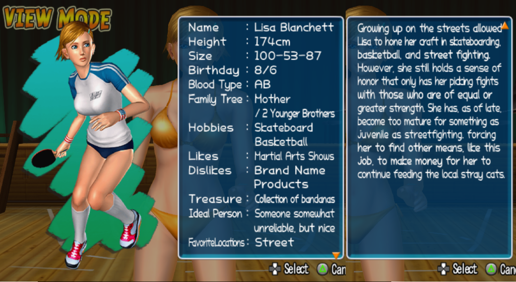 Best of all, the profile pages return, with some fun new tidbits. Like, for example, we find out that Lisa is now dating Ryota (the protagonist of Pink Pong‘s story mode), for some inexplicable reason. We also get a recurring reference to Riho’s insecurity that she may be getting fat and… c’mon, Riho, you’re beautiful, don’t be so hard on yourself. Is this the first time I’m actually feeling something for this character? Yes, yes it is, and I had to dig through the menus in two separate games to get there.