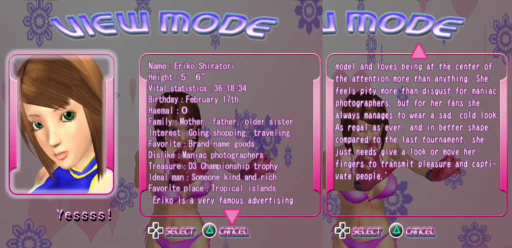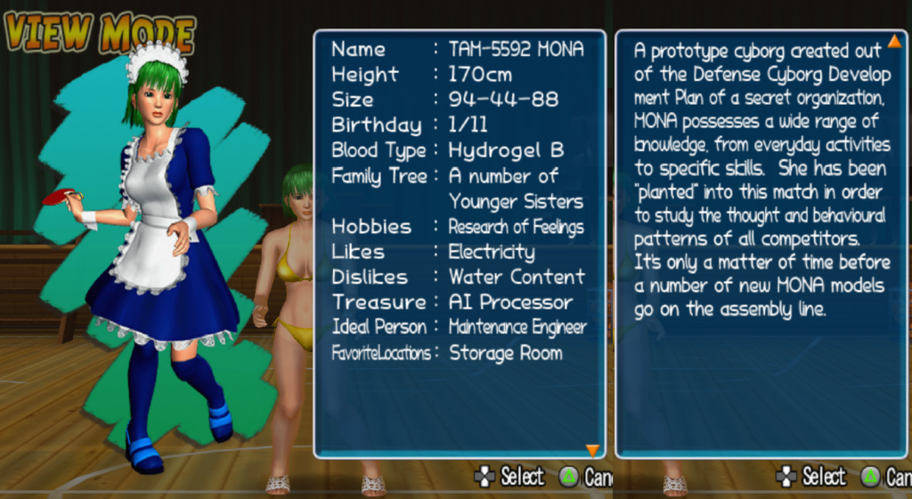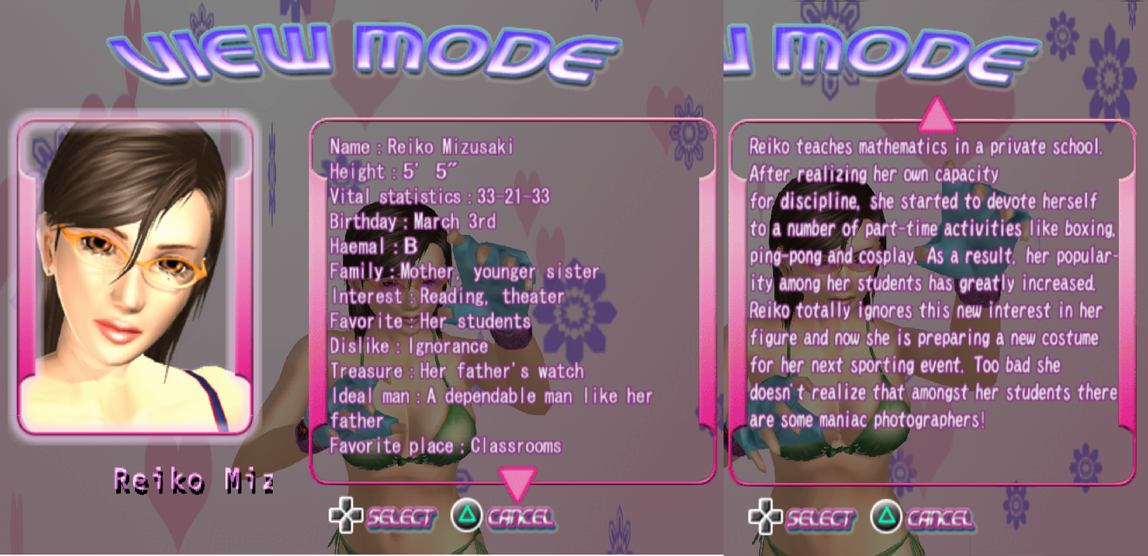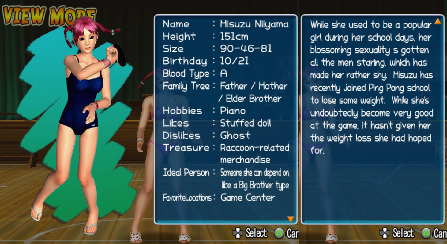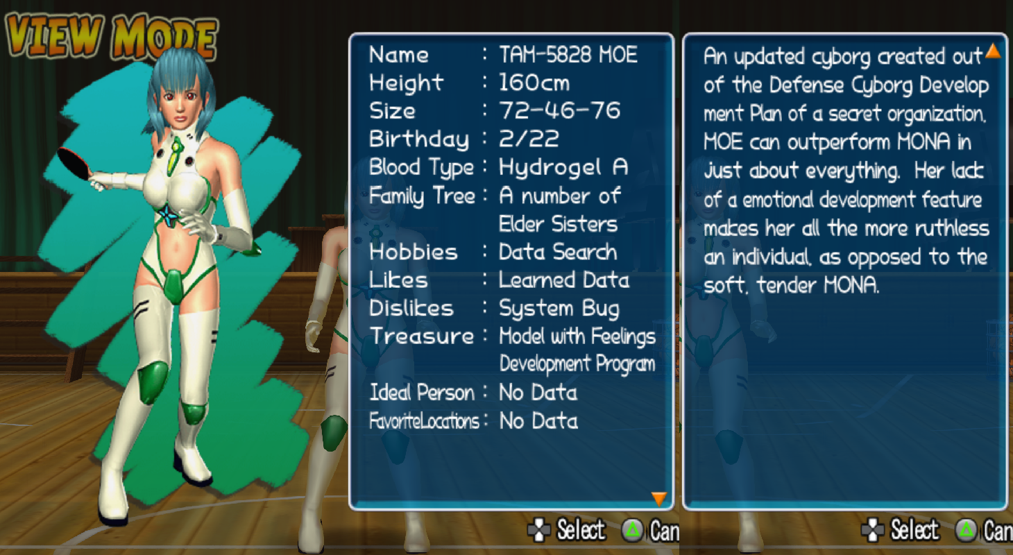 Best of all, the profile pages return, with some fun new tidbits. Like, for example, we find out that Lisa is now dating Ryota (the protagonist of Pink Pong‘s story mode), for some inexplicable reason. We also get a recurring reference to Riho’s insecurity that she may be getting fat and… c’mon, Riho, you’re beautiful, don’t be so hard on yourself. Is this the first time I’m actually feeling something for this character? Yes, yes it is, and I had to dig through the menus in two separate games to get there.
