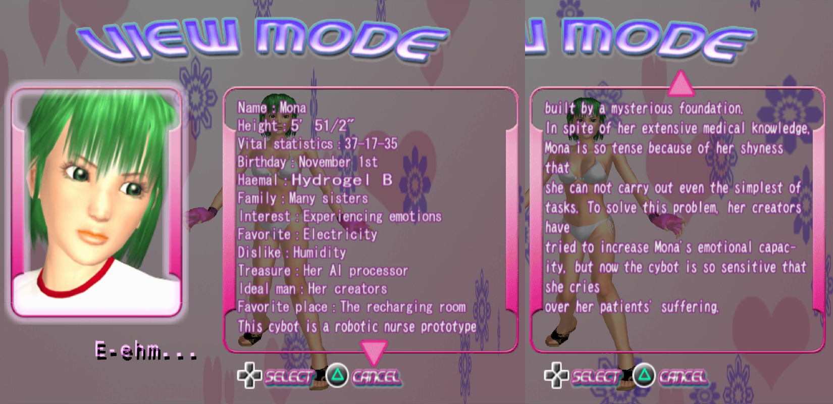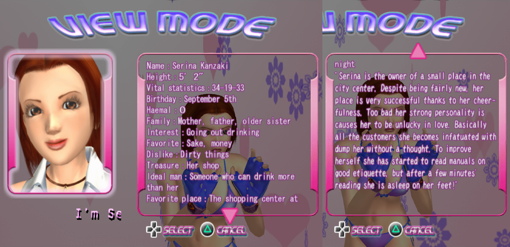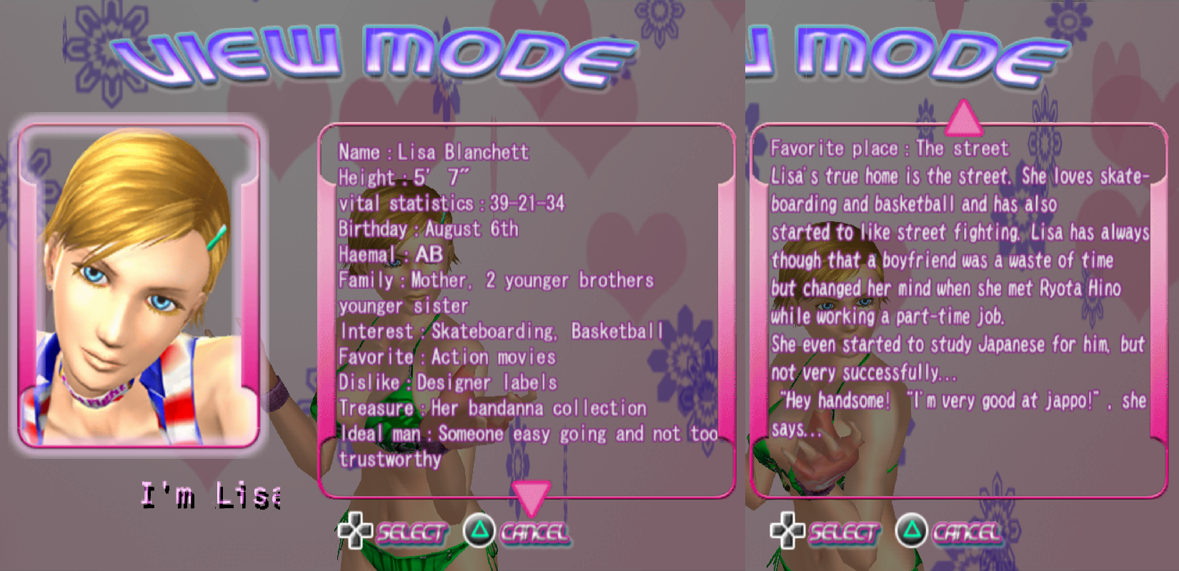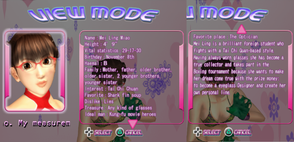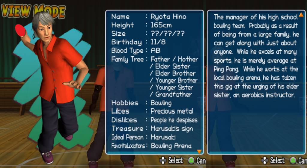 Best of all, the profile pages return, with some fun new tidbits. Like, for example, we find out that Lisa is now dating Ryota (the protagonist of Pink Pong‘s story mode), for some inexplicable reason. We also get a recurring reference to Riho’s insecurity that she may be getting fat and… c’mon, Riho, you’re beautiful, don’t be so hard on yourself. Is this the first time I’m actually feeling something for this character? Yes, yes it is, and I had to dig through the menus in two separate games to get there.