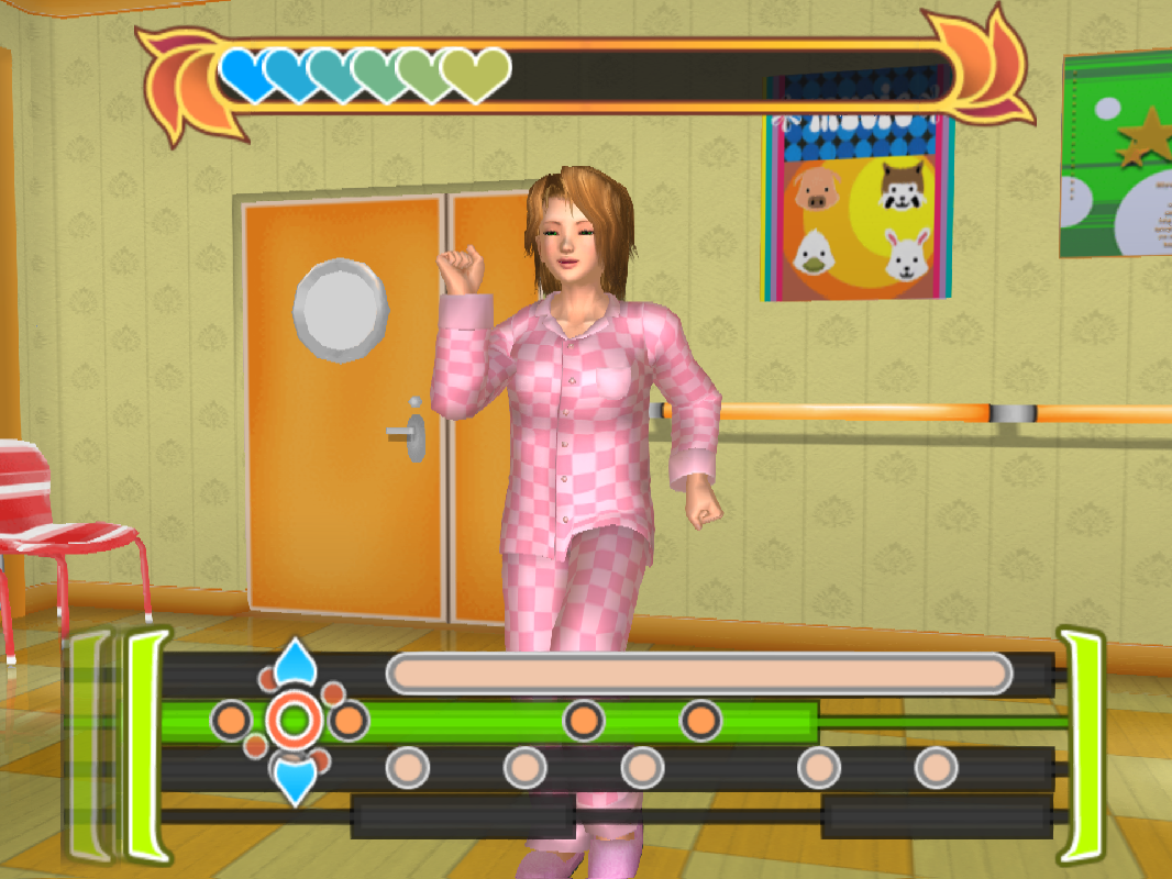 Fitness Fun is, once again, reusing Riho’s character model from Pink Pong, but it still looks solid, even this late in the PS2’s lifecycle. The levels are simple, but detailed well-enough, and the visual effects that play as you perform well are aesthetically pleasing. I also really like how the menu screen is diegetic, having you go to different areas of Riho’s bedroom for options, new outfits, the next level, etc.