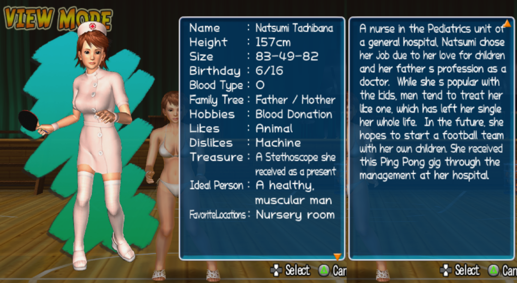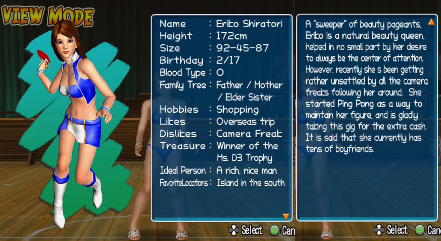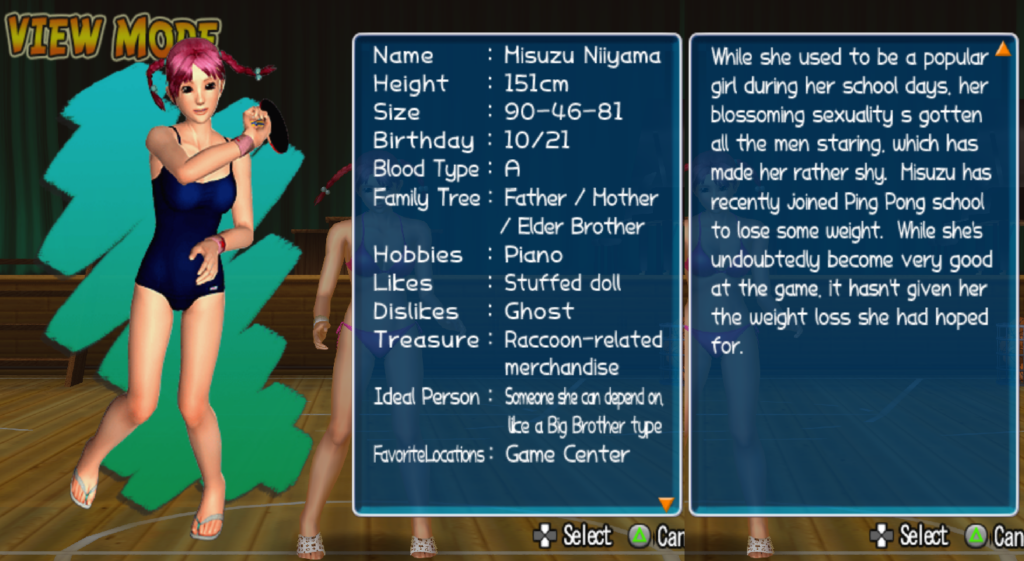 While you can play table tennis against women in bikinis as soon as you start the game, this is relegated to free play and versus modes only (no bikinis allowed in story mode, weirdly enough). The game also has jiggle physics (naturally), which bounce wildly every time the girls swing their rackets. There’s also a character viewer mode, which allows you to zoom in on all of the characters’ assets as closely as you’d like. Perhaps most importantly, the improved graphics and art style allow some of this game’s cast to be genuinely attractive: Riho, Reiko, Lisa, and Serina are all very easy on the eyes.