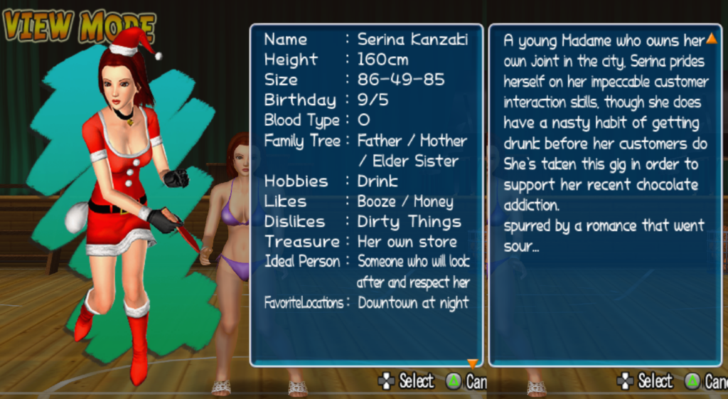 To demonstrate what I mean, for the most part you’re just… playing table tennis against attractive women. If you win against them in story mode, you get to keep their clothes as a reward and briefly see them in a bikini, but this only happens the first time you beat them. You start the game with the girls’ bikinis unlocked, but then when you unlock new costumes in story mode, they’re just the girls’ regular outfits (but now the other characters can try them on). That’s right, in this “sexy” table tennis game, you’re rewarded with more clothes when you win. Granted, some of these outfits feel like they were added purely to cater to some specific fetishes (particularly the Santa dress, unzipped biker outfit, and the Chinese dress), but this is still a step down from a goddamn bikini.