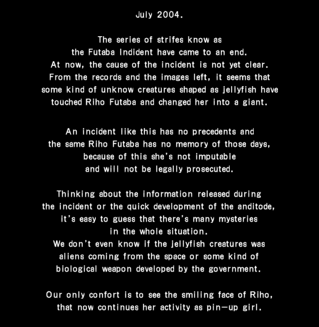 The only real character here (aside from the aliens, if you count them???) is Riho Futaba herself… and boy, she’s larger than life. She’s not really much of a character if we’re being honest: she seems dumb and confused, even before she gets turned into a giantess, and then spend the whole game milling about or getting mind-controlled by the aliens. She’s certainly memorable, but not for her characterization.