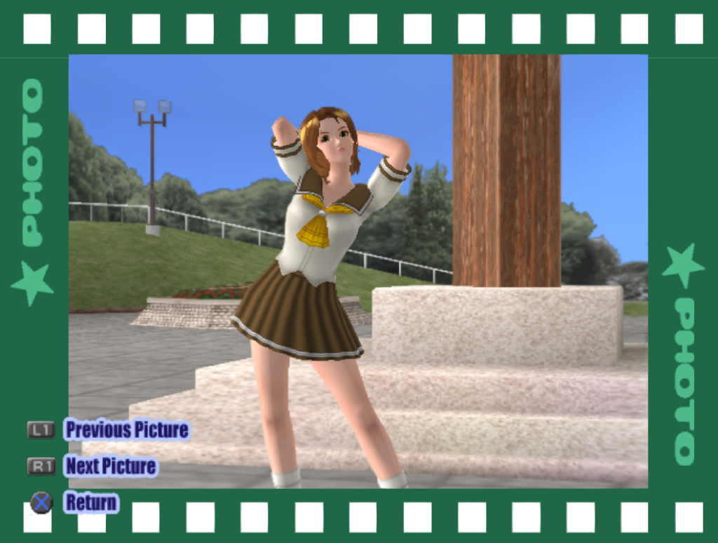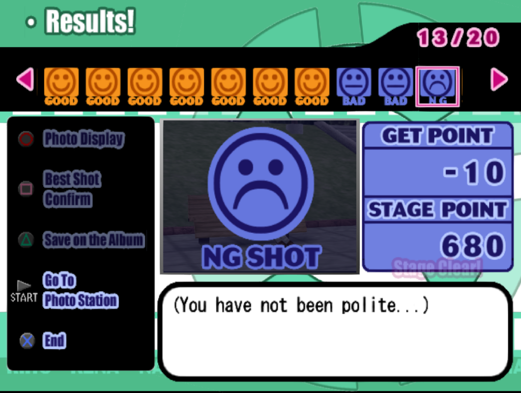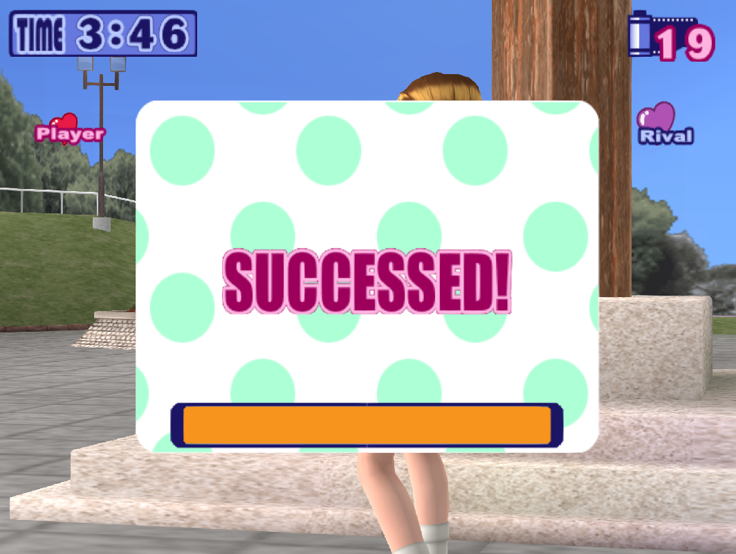 The gameplay doesn’t just end at snapping photos either, as there’s also a lite relationship-building mechanic as well. While you only have five minutes to take your shots, you really should spend some time getting your subject’s attention. After entering a couple button prompts correctly (complete with a hilarious “SUCCESSED!” pop-up upon completion), you can get her to look at you and/or perform a special pose. You really need to get the model to like you if you want to maximize your photos’ scores… and she might even start to notice you more too, if you’re lucky…