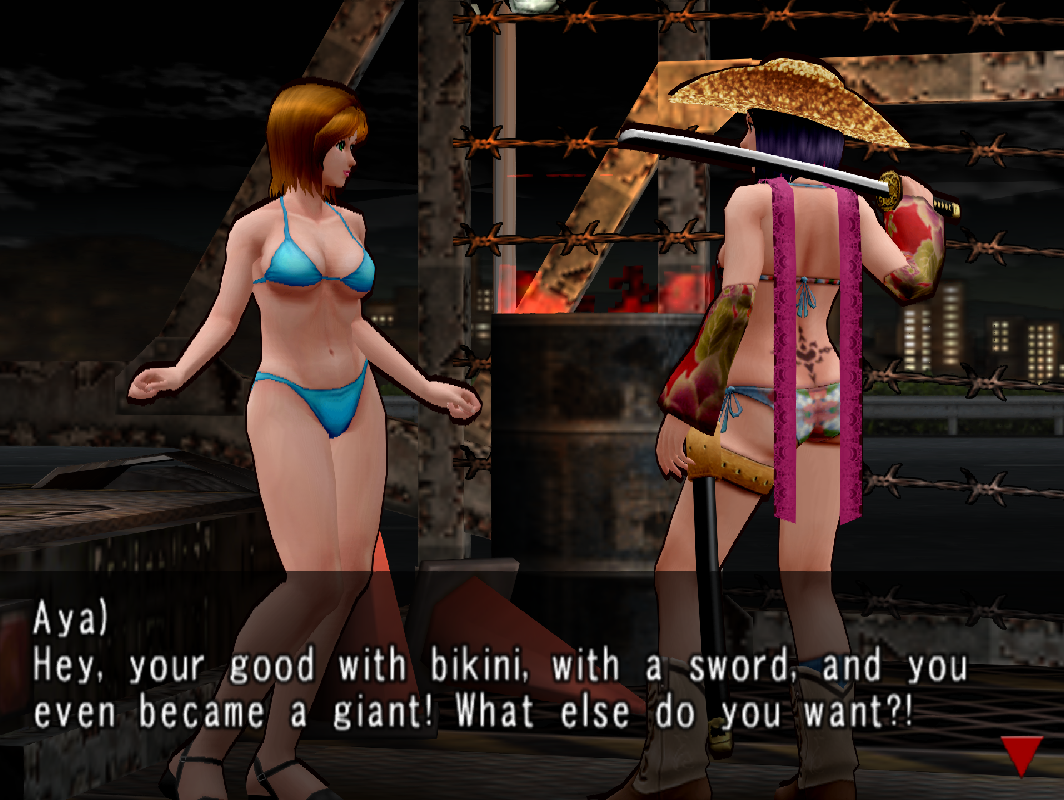 Like I said in the intro, Zombie Hunters is an expanded re-release of the original Onechanbara. In addition to Aya (the main character of the Onechanbara games), this version has added Riho Futaba and her younger sister, Makoto. Unfortunately, Riho doesn’t get her own unique story or cutscenes… she’s basically just thrown into contextless levels that you complete just because the game said so. That said, I do appreciate that Riho’s berserk mode causes her to become mind-controlled by one of the aliens from Demolition Girl… but maybe that’s just because it reminds me of a much better game.
